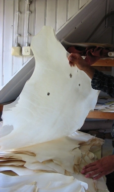 Ausgangsmaterial sind Häute von Kalb, Ziege und Schaf. Während bei der Lederherstellung das Fasergeflecht